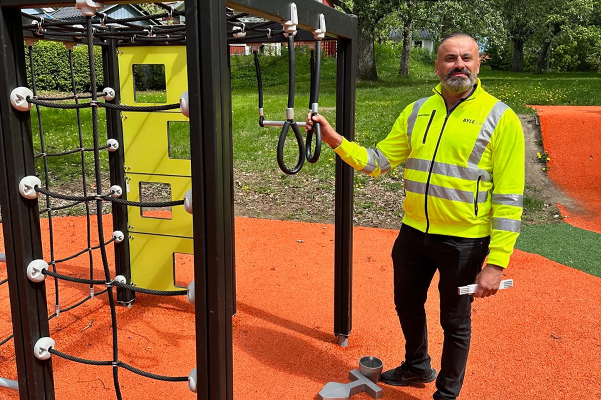- Kontrollera om området runt lekplatsen är rent och fritt från skräp och farliga föremål.