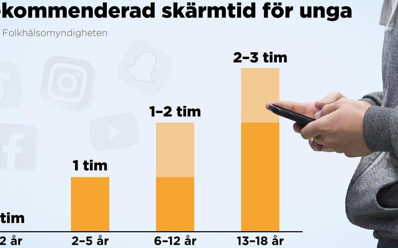 Folkhälsomyndigheten rekommenderar att barn och ungdomar under 18 år begränsar sin skärmtid till en rimlig nivå. Detta för att minska risken för övervikt, sömnbesvär och andra hälsoproblem som kan uppstå till följd av för mycket tid framför skärmen. Myndigheten betonar vikten av en balanserad livsstil, där barn och ungdomar även har tid för fysisk aktivitet, sociala aktiviteter och annan meningsfull sysselsättning.